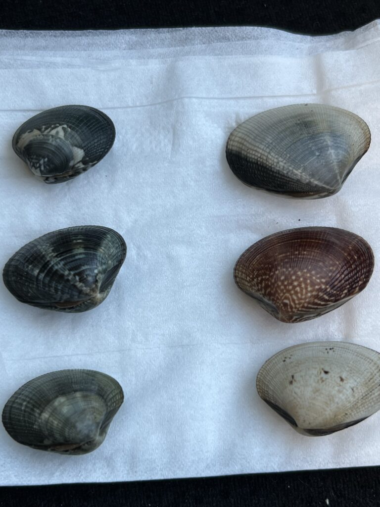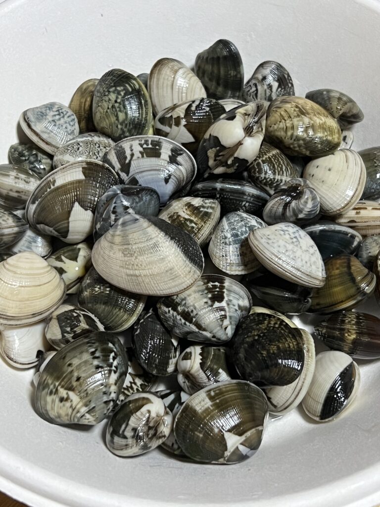 沖合のアサリは、干潟と比べて環境変化が少ないため、模様も比較的少なく均一になることが多いです。